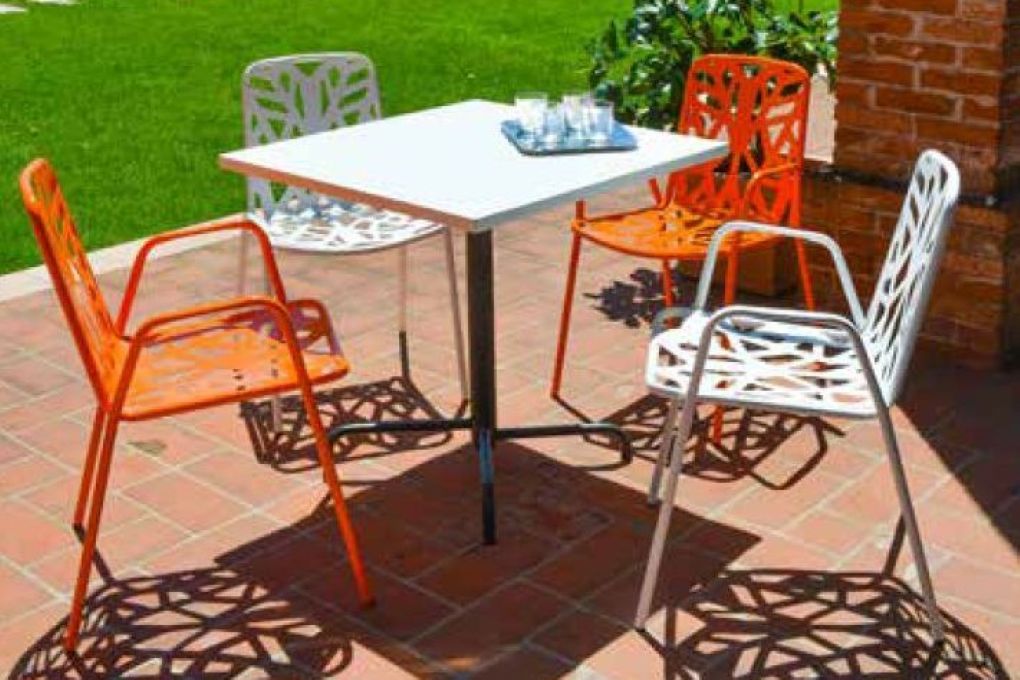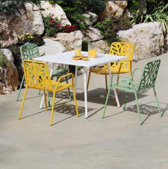 Gefertigt ist der Stuhl aus hochwertigem, pulverbeschichtetem Stahl. Dieses Material ist nicht nur besonders stabil, sondern auch optimal gegen äußere Einflüsse geschützt. Die Pulverbeschichtung sorgt dafür, dass der Stuhl rostfrei bleibt und selbst bei starker Sonneneinstrahlung oder Regen seine Farbe und Struktur behält. Zudem ist die Oberfläche angenehm glatt und leicht zu reinigen – ein großer Vorteil für den täglichen Einsatz im Freien.