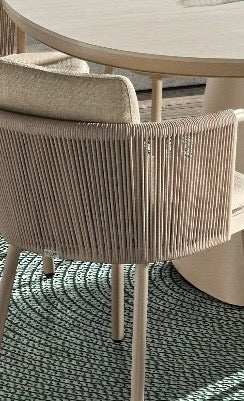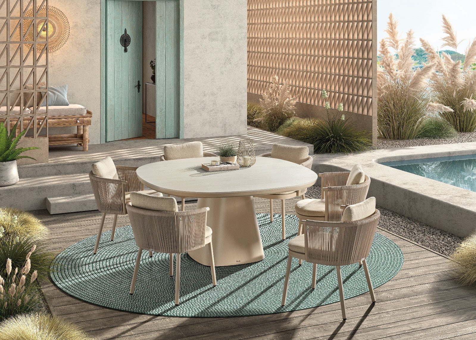 Das Travertino Set besteht aus 6 Sesseln und einem Tisch mit einem Durchmesser von 150cm.